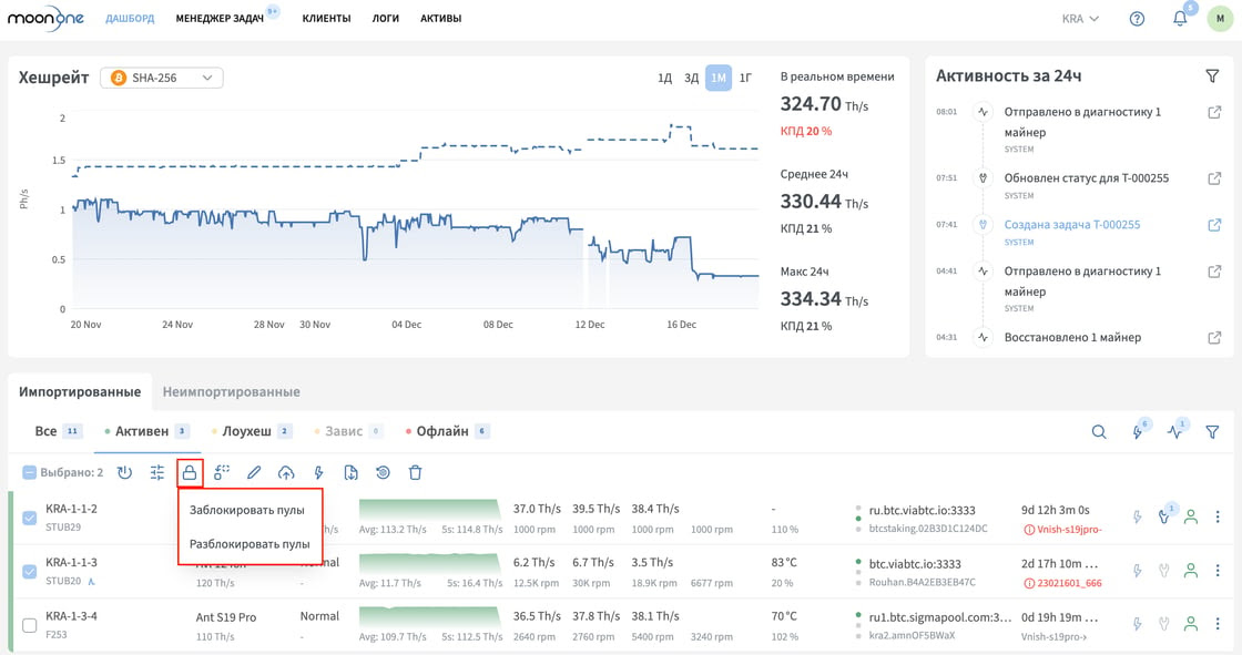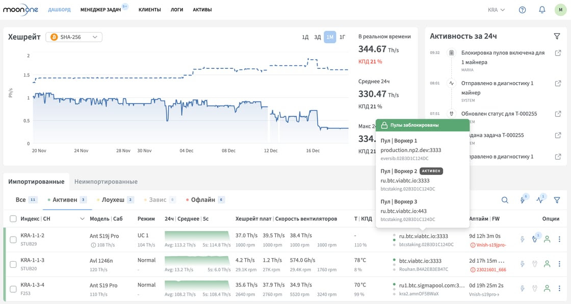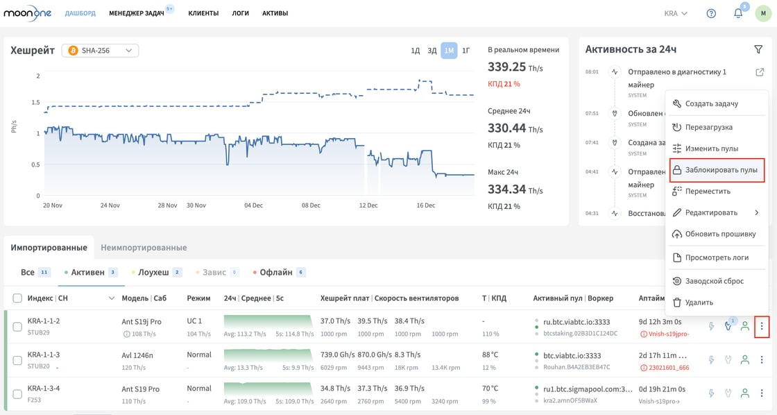 Блокировка пулов решает эту важную задачу безопасности на уровне системы мониторинга асиков Moonone, устраняя сам источник инцидентов.